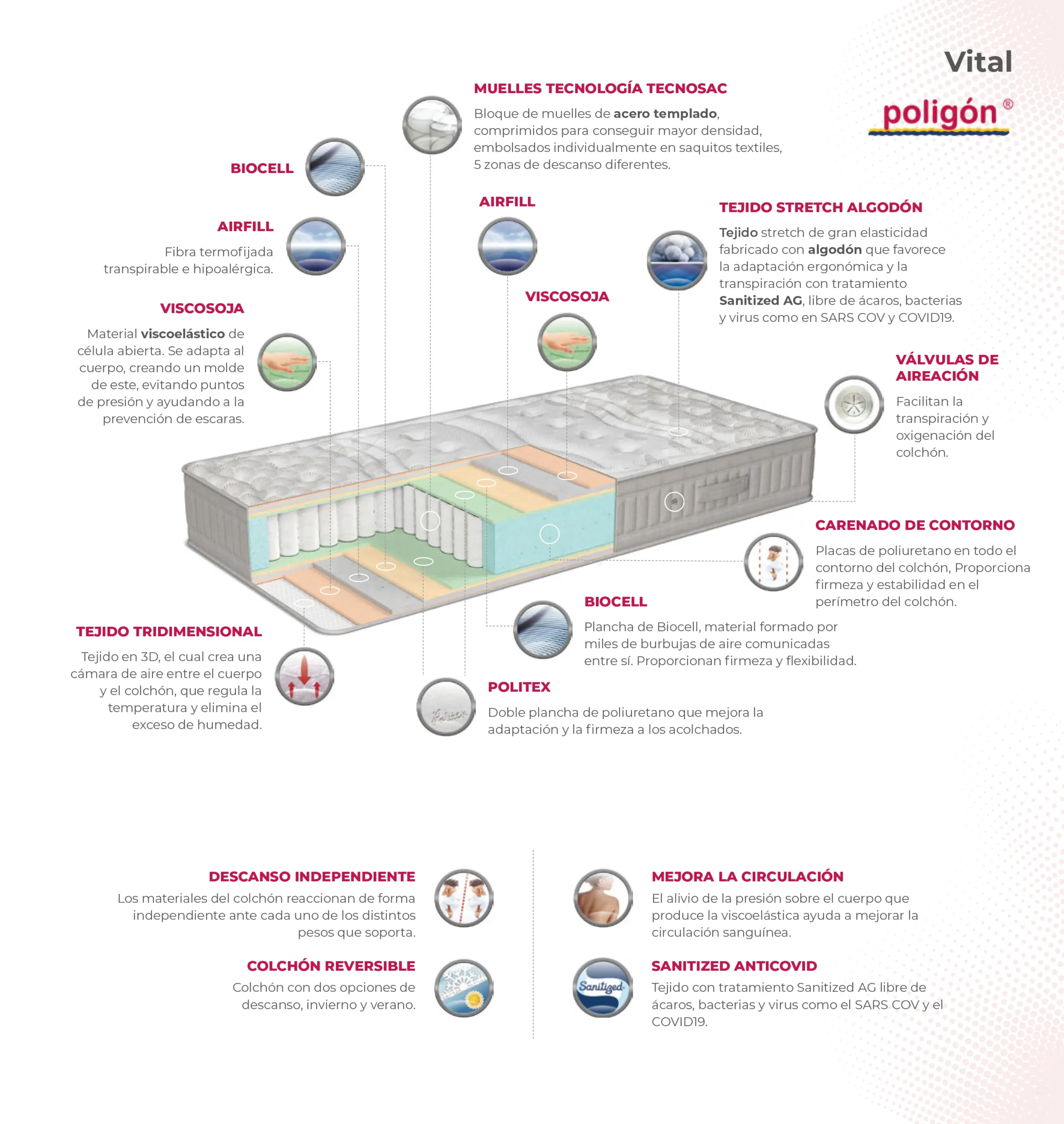 El colchón Vital combina tecnología avanzada y materiales de alta calidad para ofrecerte el máximo confort, higiene y durabilidad en tu descanso. Un modelo diseñado para quienes buscan ergonomía, independencia de lechos y protección sanitaria.